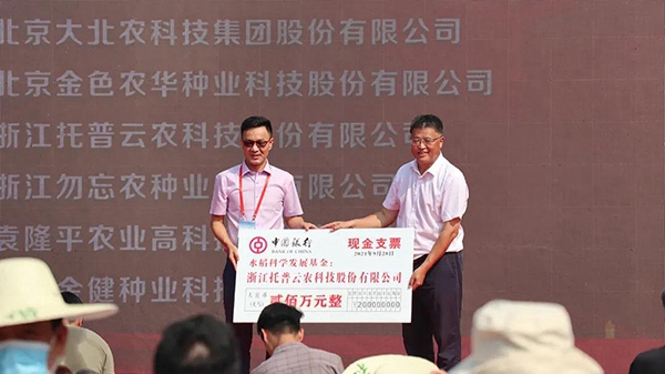 托普云農董事長陳渝陽向“水稻科學發展基金”捐贈資金